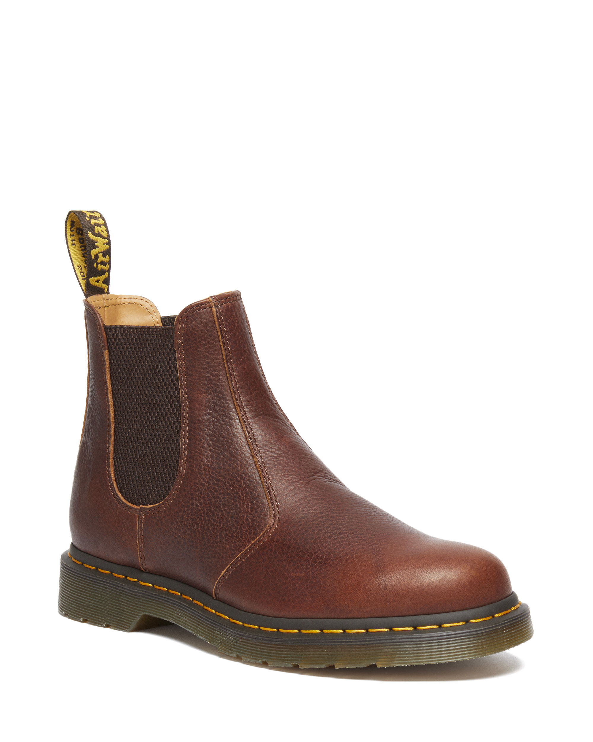 We gaan voor zacht met deze vernieuwde versie van onze klassieke 2976 Chelsea boot in luxueus Ambassador leer. Dit getrommelde materiaal heeft een geoliede afwerking en zachte houvast en vormt zich vanaf dag één naar je voeten – waardoor het Original Dr. Martens silhouet comfortabeler dan ooit is. De zool is bevestigd met DM’s gele stiksel en voorzien van onze kenmerkende groeven. De bovenkant van de laars is gelabeld met onze onmiskenbare zwart-gele hiellus.
