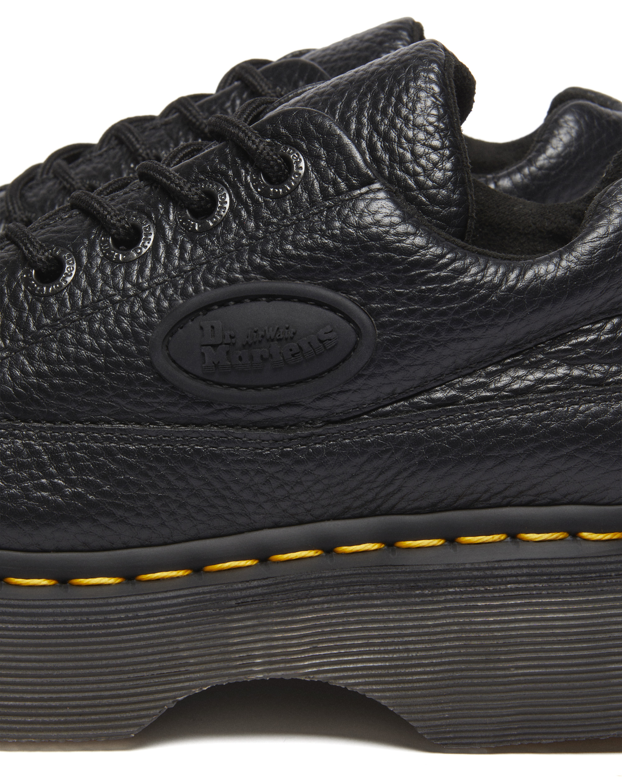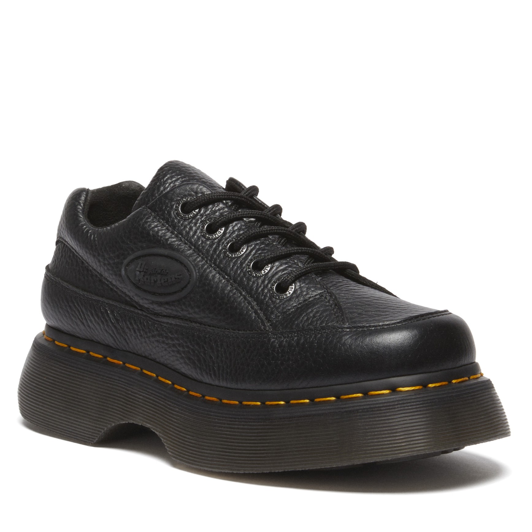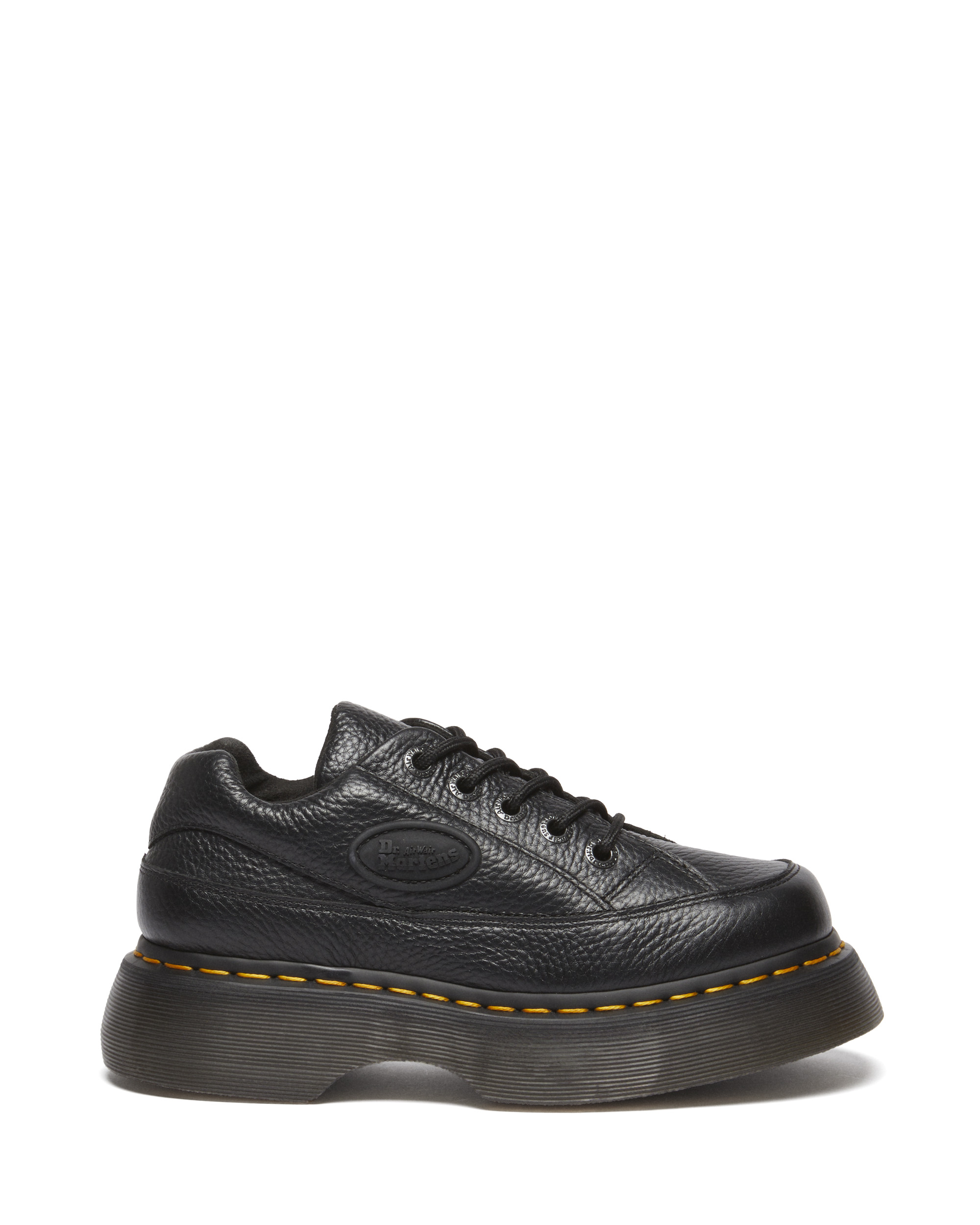 Beleef de Buzz. Onze nieuwe Buzz schoen met vijf veterogen is geïnspireerd door onze 90s silhouetten en is van top tot teen een eyecatcher. Hij is bevestigd op onze chunky afgeronde Buzz zool — gekenmerkt met DM’s groeven, gele stiksels en een bladerpatroon op het loopvlak. Het bovenwerk van zacht getrommeld nappaleer heeft een comfortabele gewatteerde kraag en een overdreven rubberen badge met de contouren van de zool.