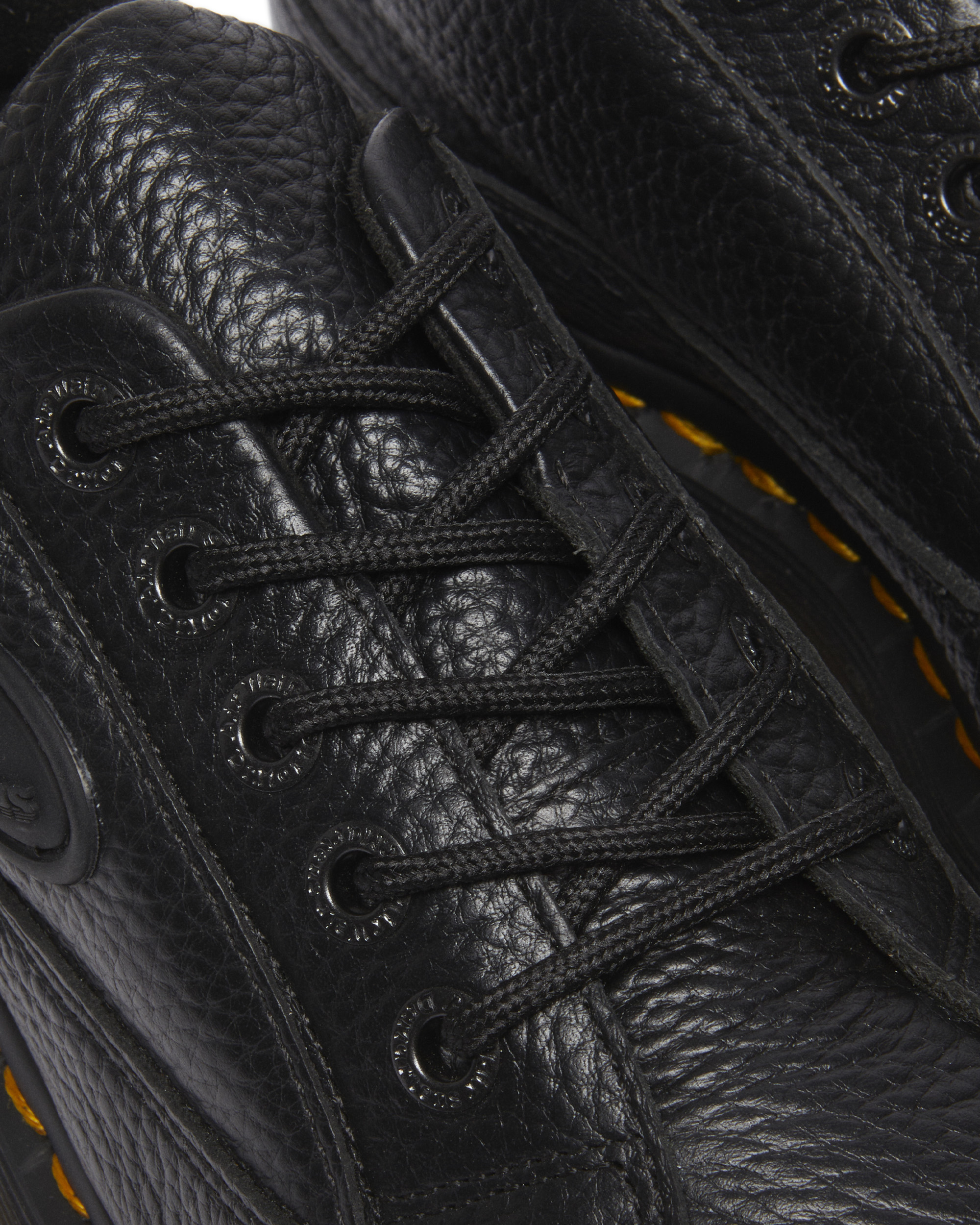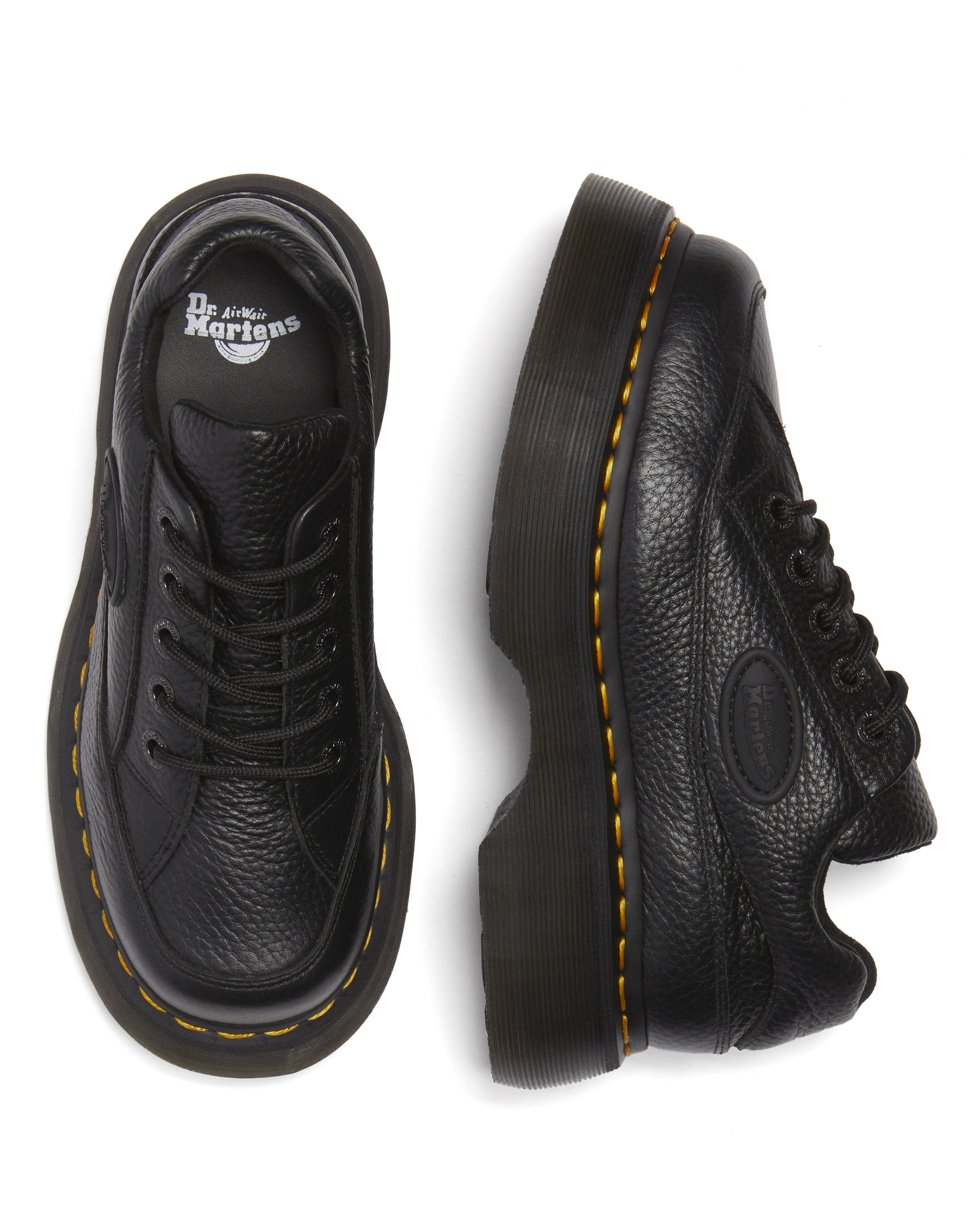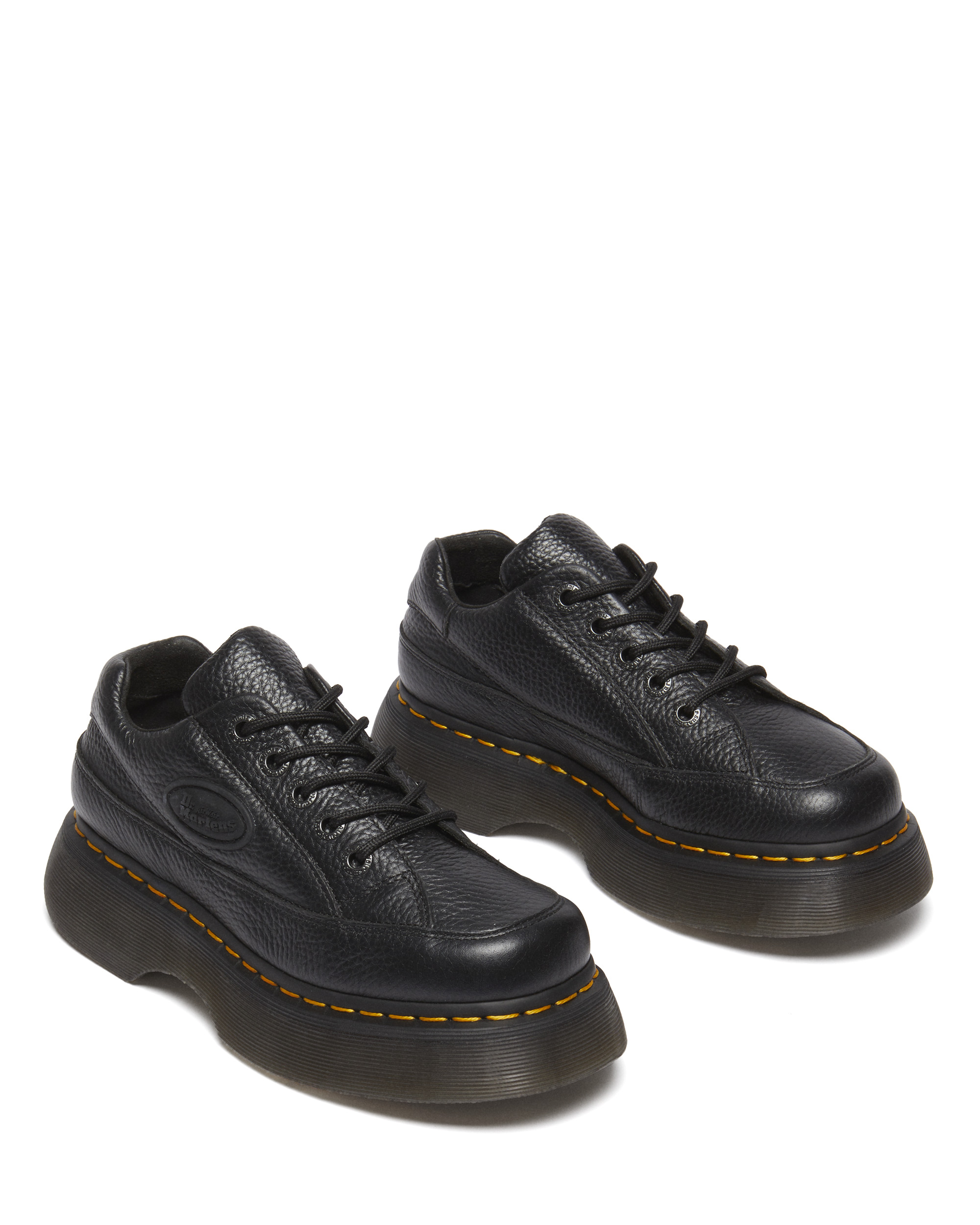 Beleef de Buzz. Onze nieuwe Buzz schoen met vijf veterogen is geïnspireerd door onze 90s silhouetten en is van top tot teen een eyecatcher. Hij is bevestigd op onze chunky afgeronde Buzz zool — gekenmerkt met DM’s groeven, gele stiksels en een bladerpatroon op het loopvlak. Het bovenwerk van zacht getrommeld nappaleer heeft een comfortabele gewatteerde kraag en een overdreven rubberen badge met de contouren van de zool.