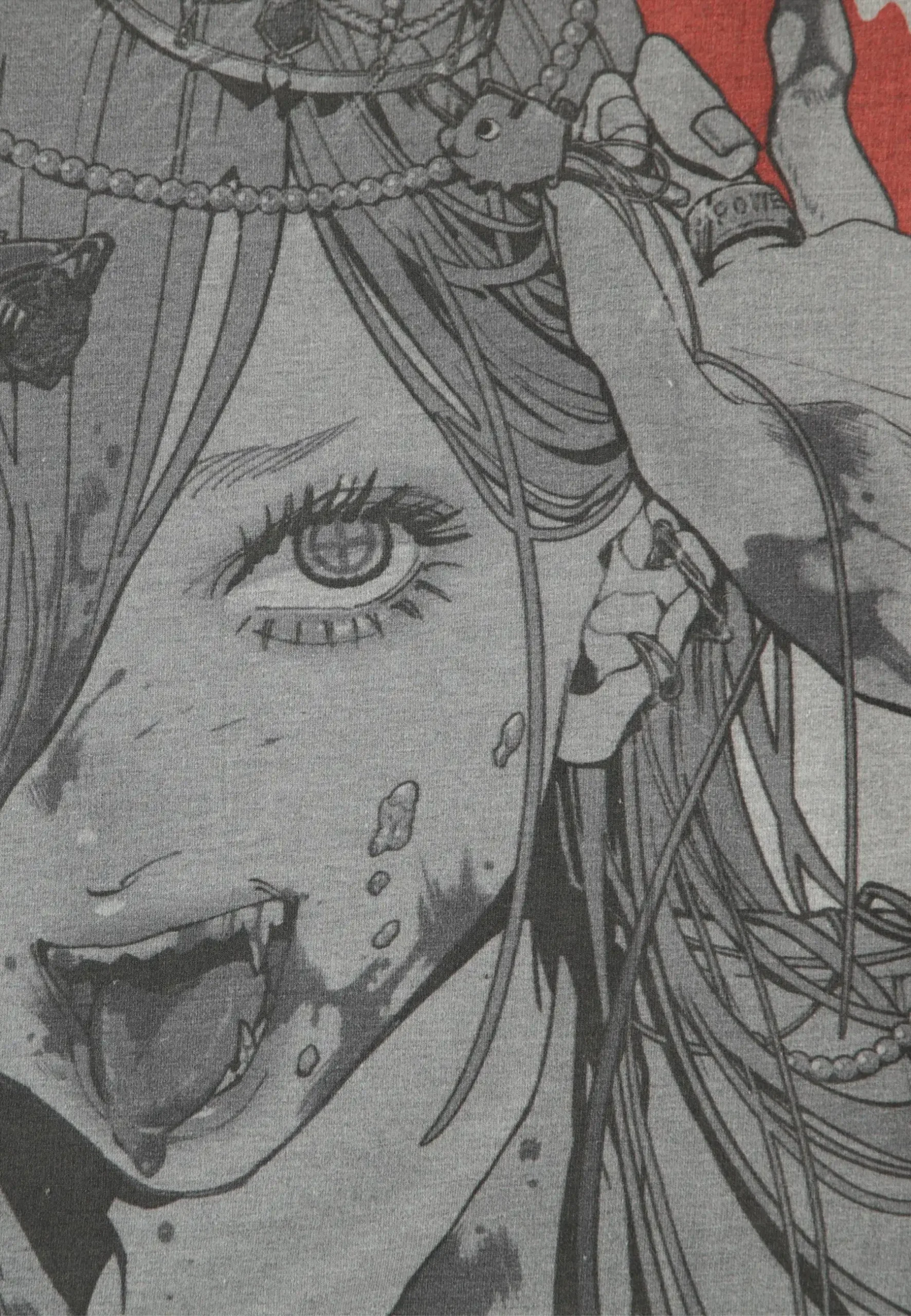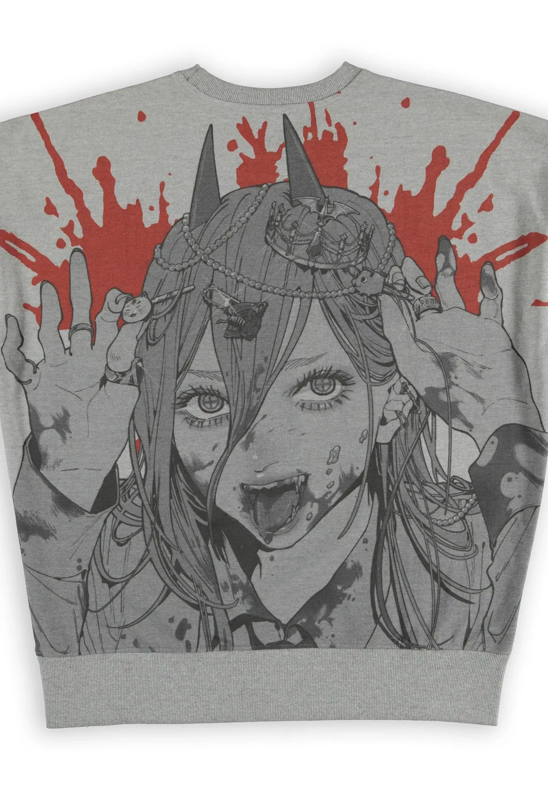 Officially licensed Chainsaw Man merch, this grey crewneck sweater taps straight into Power’s wild fan appeal. The front features the Chainsaw Man logo with a blood splatter accent, while the back explodes with a large black-and-white manga illustration of Power framed in crimson chaos. Designed for fans who love their anime merch fierce, dark, and deeply unhinged.