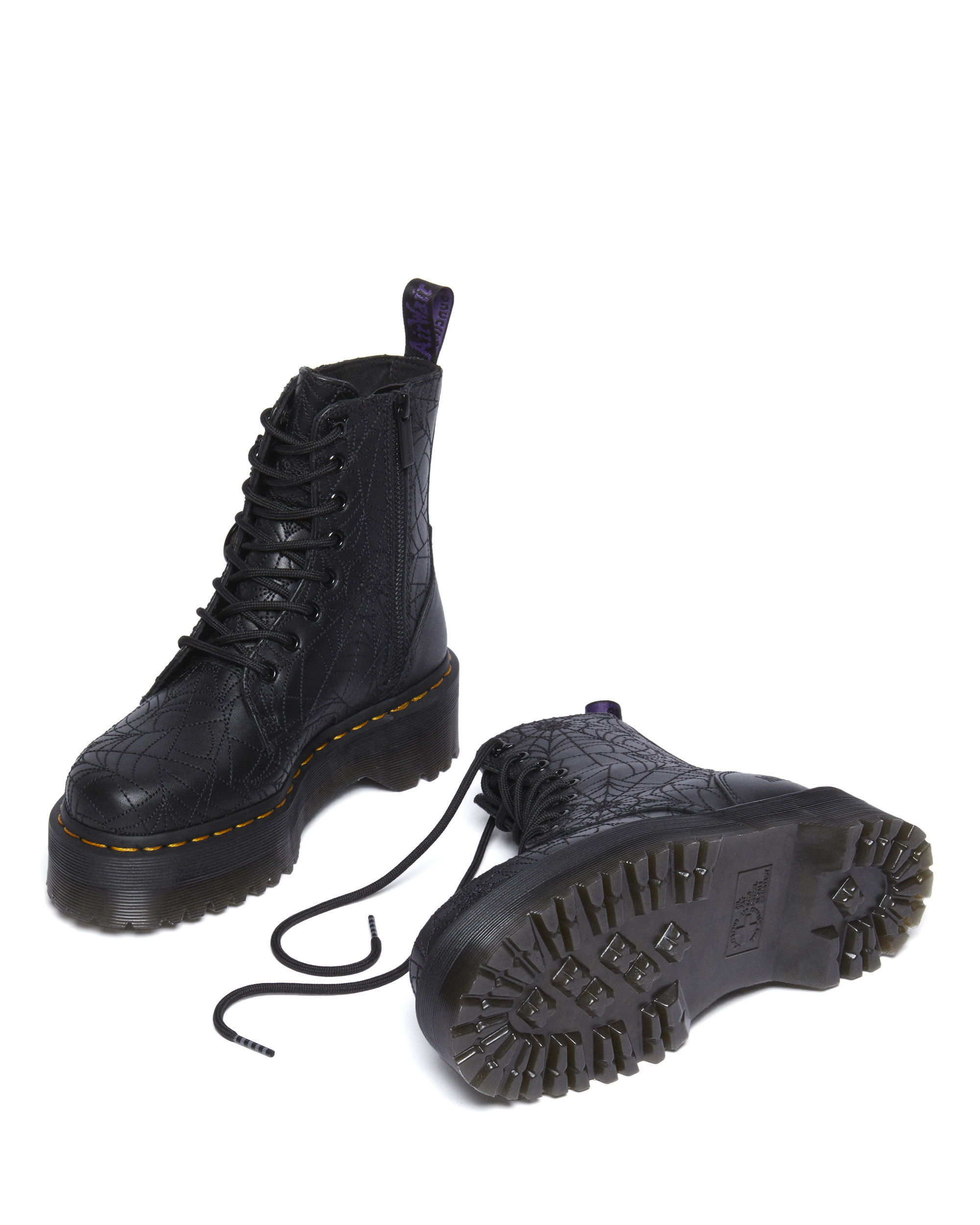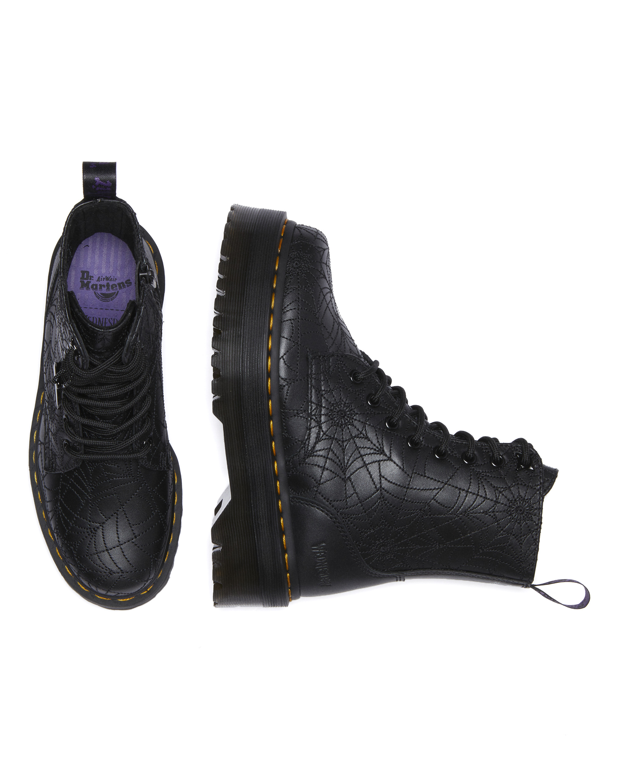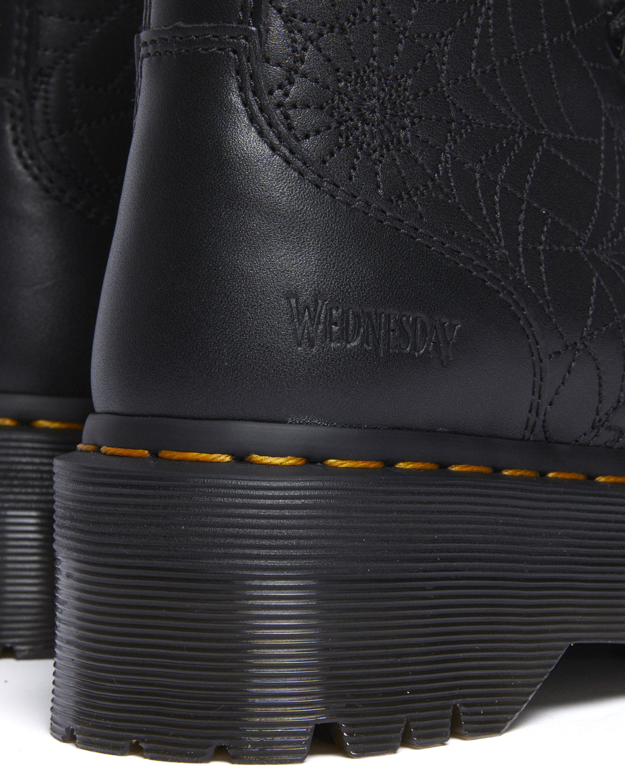 Outcasts are in. Deze DM’s x Wednesday limited-edition van onze Jadon laars is gemaakt van Nappa Lux leer met borduursel geïnspireerd door het gebrandschilderde slaapkamerraam van Wednesday en Enid aan de Nevermore Academy.