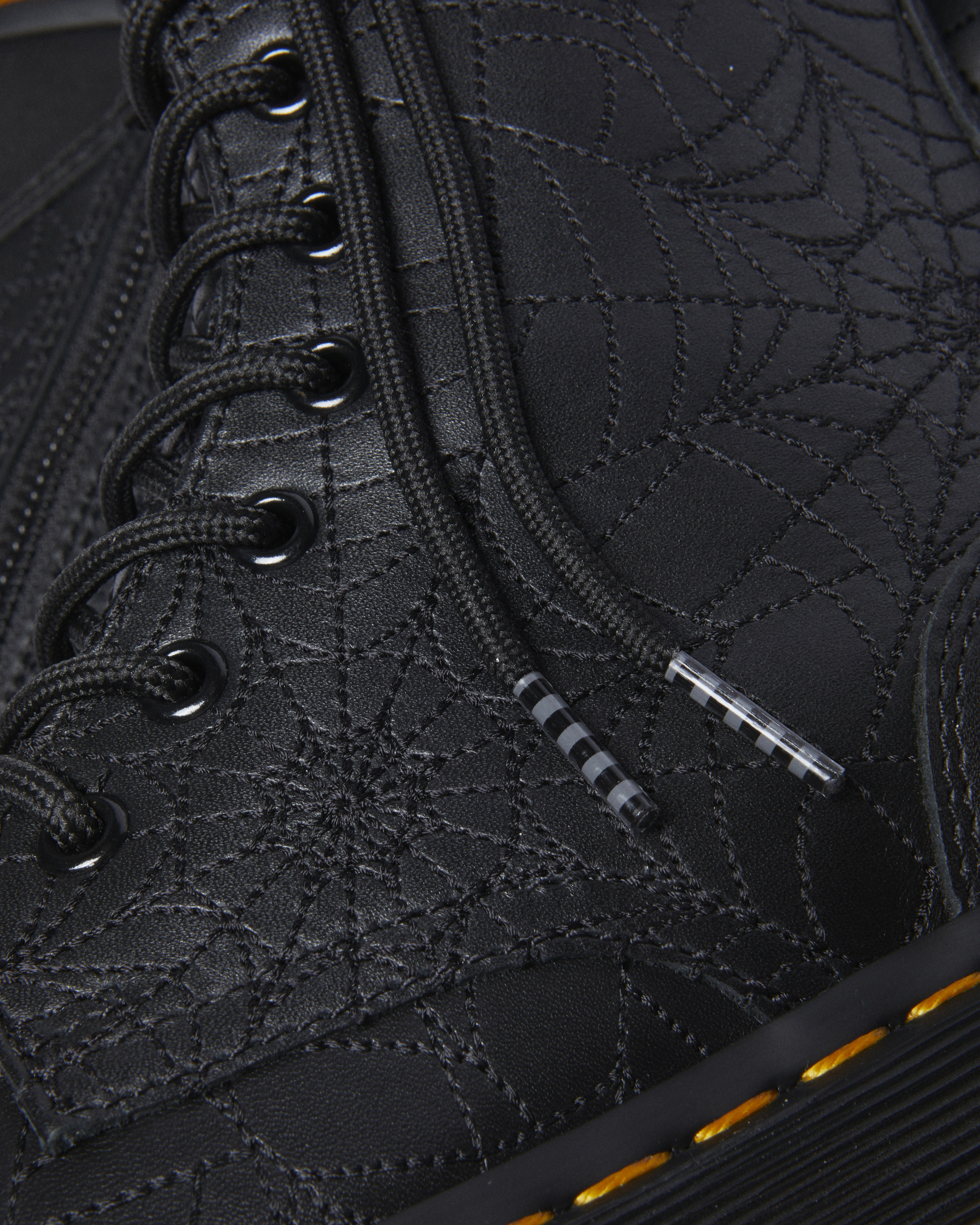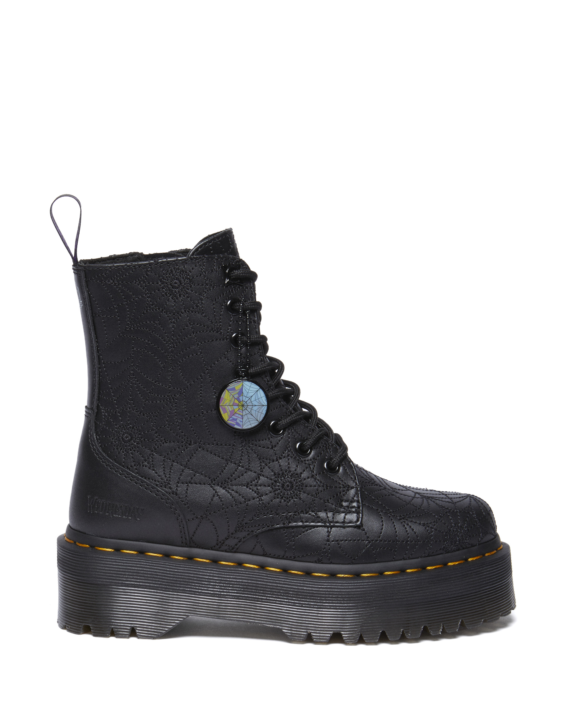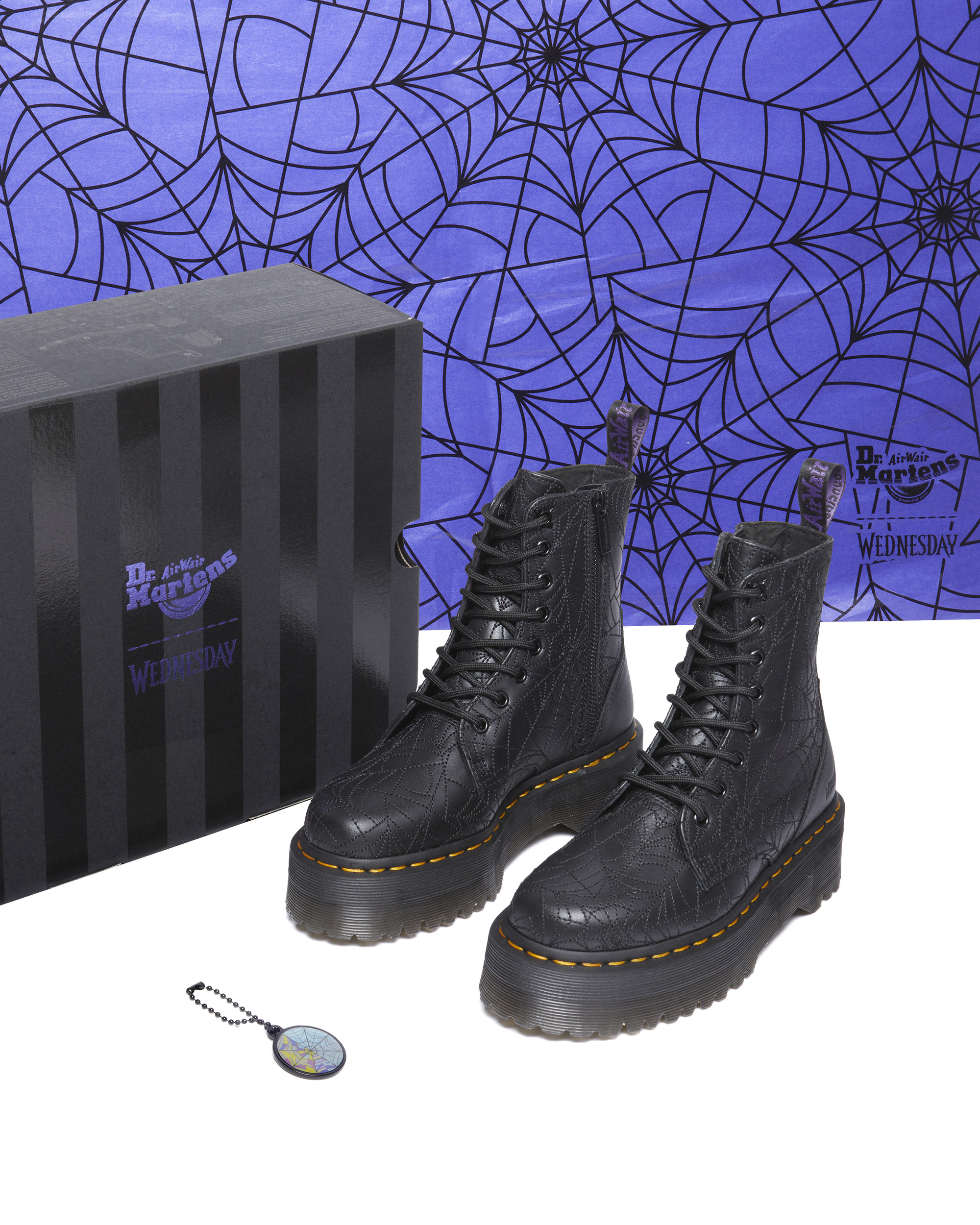 Outcasts are in. Deze DM’s x Wednesday limited-edition van onze Jadon laars is gemaakt van Nappa Lux leer met borduursel geïnspireerd door het gebrandschilderde slaapkamerraam van Wednesday en Enid aan de Nevermore Academy.